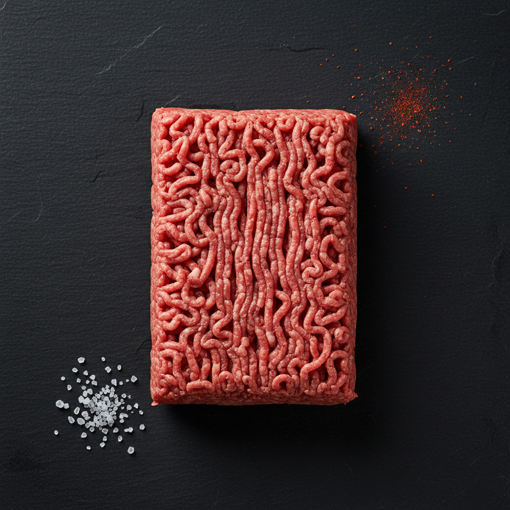 Viande hachée de la race blonde d’Aquitaine livrée assaisonné avec du sel, de l’huile et du paprika. L’huile.